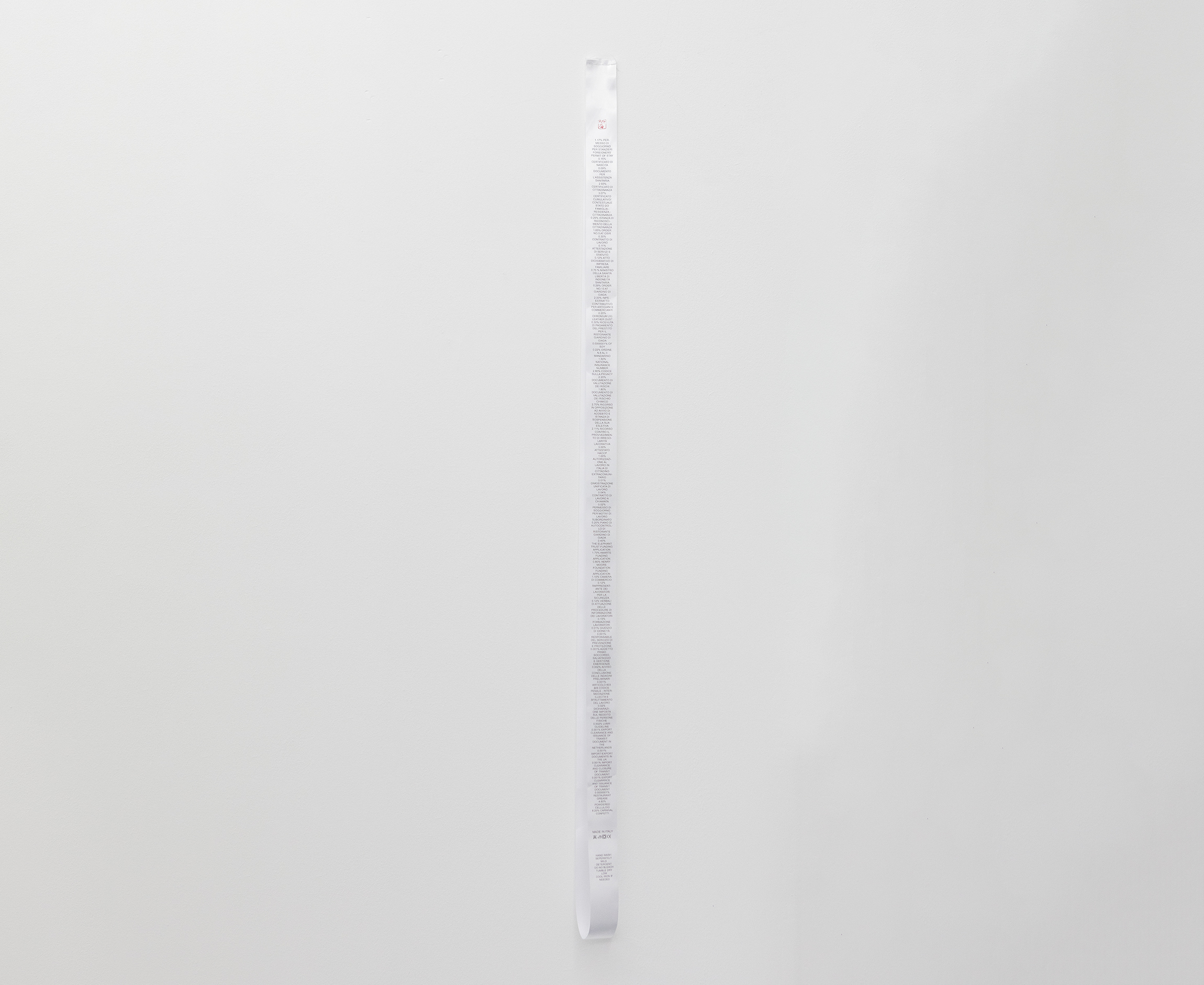 Ruoru Mou Collecting Fees Document (wash label), 2025 Wash label, cotton thread 90 x 3 cm (35 3/8 x 1 1/8 in)