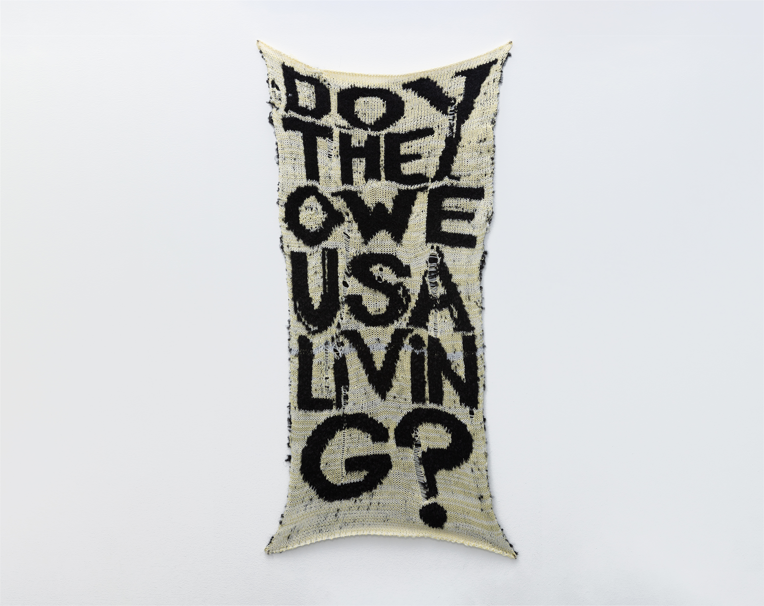 Lili Huston-Herterich Do they owe us a living?, 2025 Knitted synthetic yarns 64 x 32 cm (25 1/4 x 12 5/8 in)