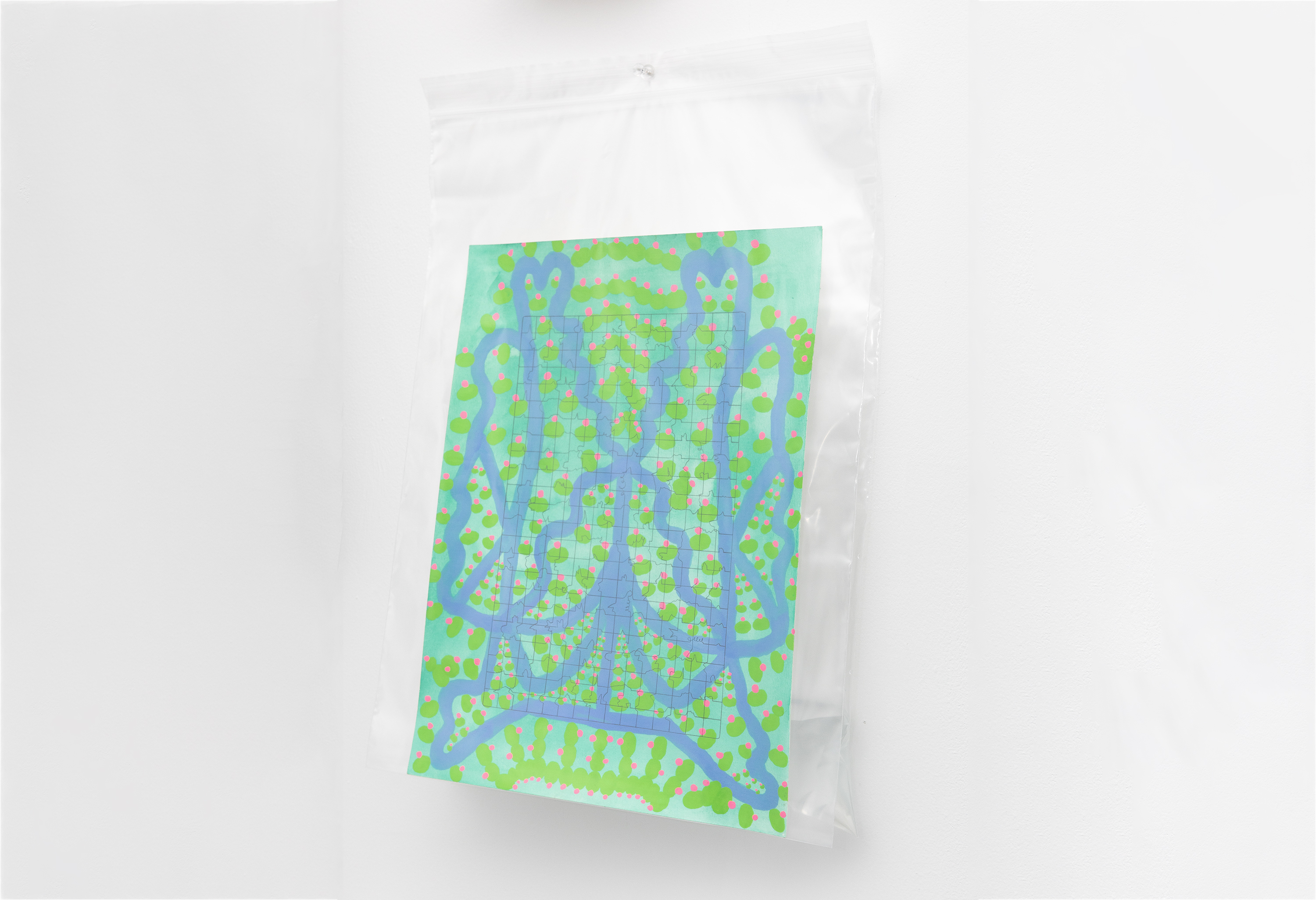 Arvo Leo Architectural drawing of an apartment tower for frogs (2021) inside Walls turned sideways are bridges (after Angela Davis) but a bag turned inside out remains just a bag, 2025 Drawing on paper on plastic bag, water 35 x 25 cm (13 3/4 x 9 7/8 in.)
