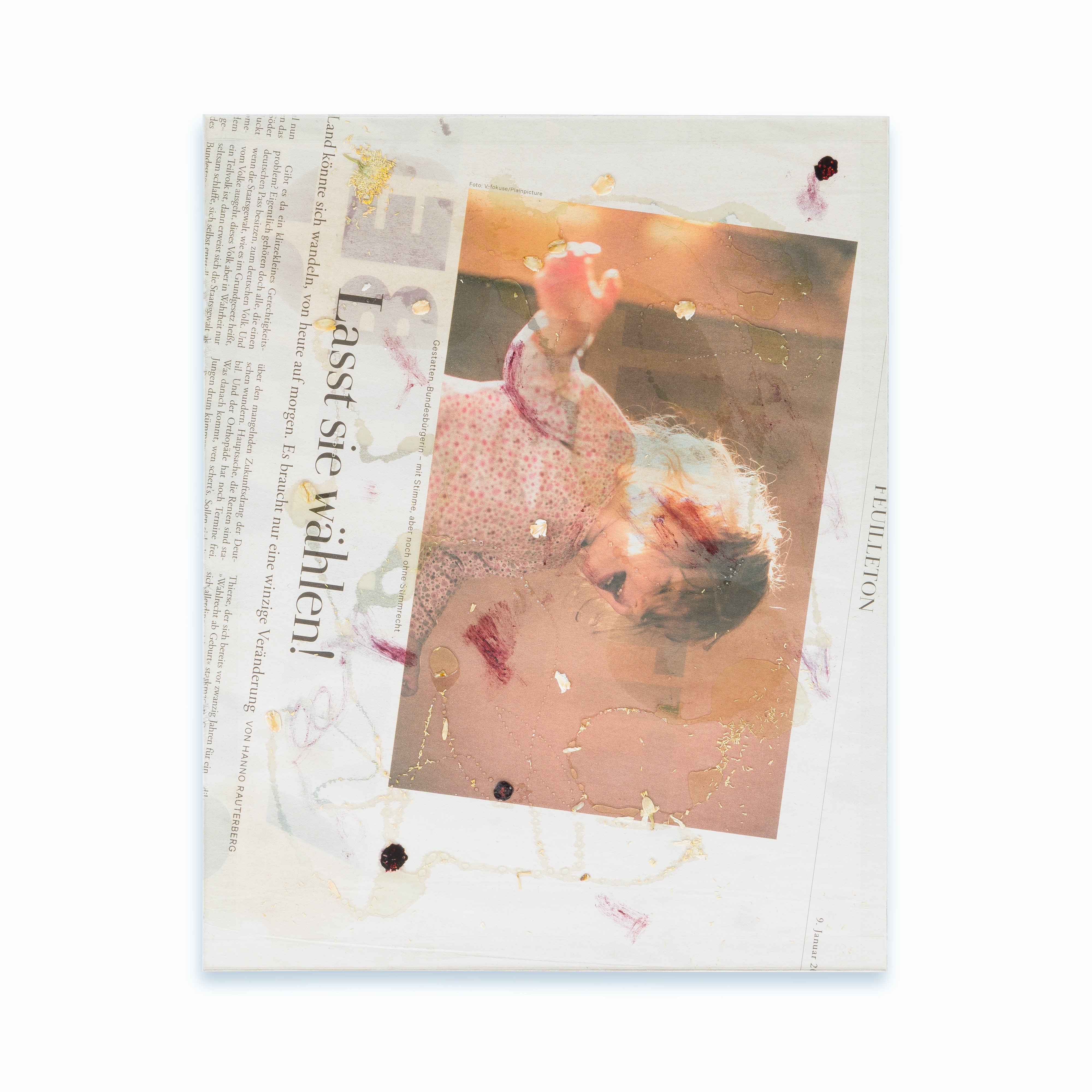 Ian Waelder Falling Up (Voters), 2025 Chamomile leaves, honey, dried cranberry, oats and olive oil on newspaper (Die Zeit, January 9th, 2025), Artglass AR 99 Water White, acid-free board, tape on Dibond, stainless steel 30 x 24 cm (11 3/4 x 9 1/2 in)