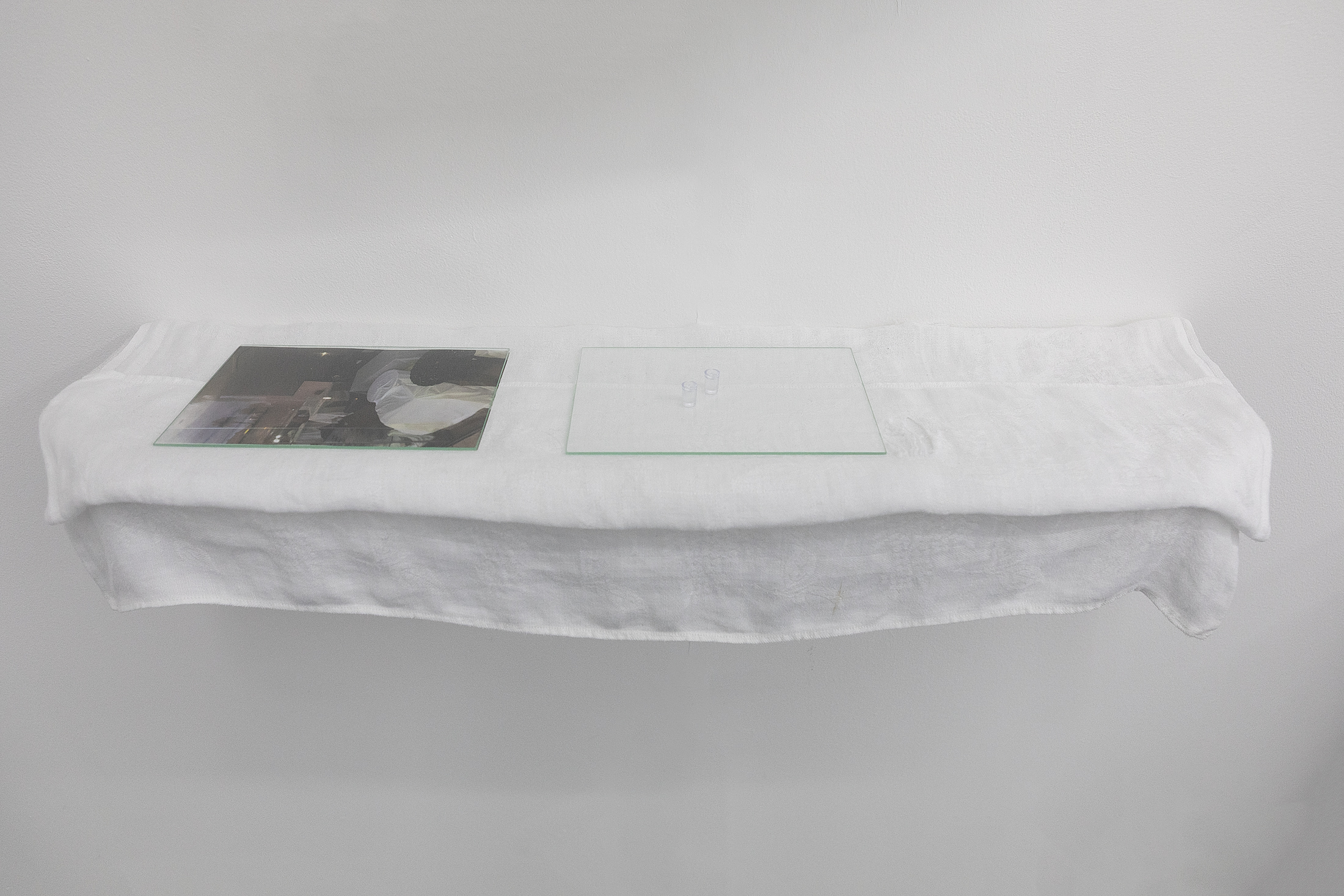 Pam Virada Untitled, 2025 C-print, glass frame, miniature drinking glass, ceramic shelf, fabric 10 x 60 x 17 cm (3 15/16 x 23 5/8 x 6 11/16 in)