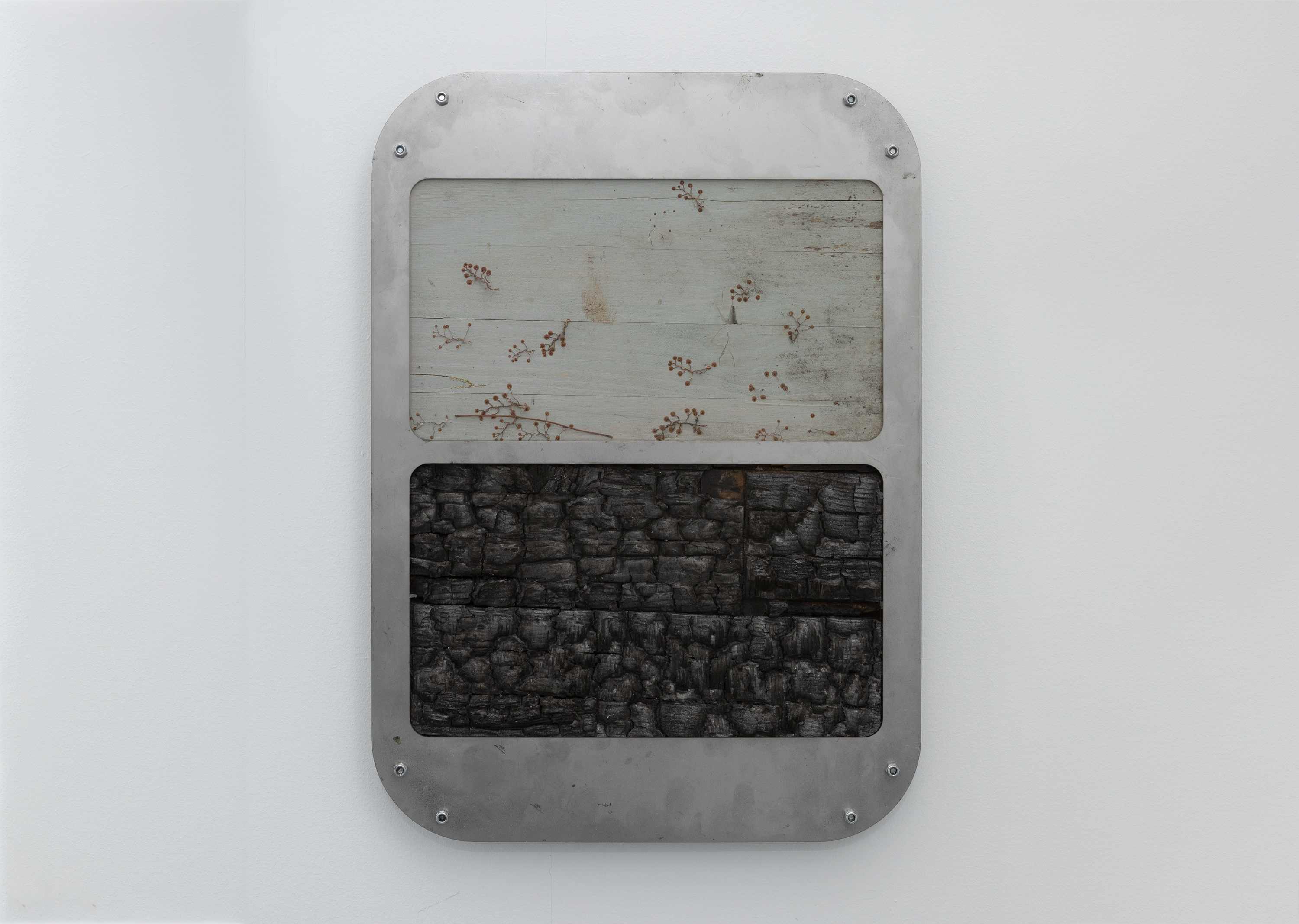 Šimon Chovan Metabolic Intuition VI, 2025 Wood from a burnt down museum of geology, wood with traces of hedera helix, stainless steel 42 x 30 x 3 cm (16 1/2 x 11 3/4 x 1 1/8 in)